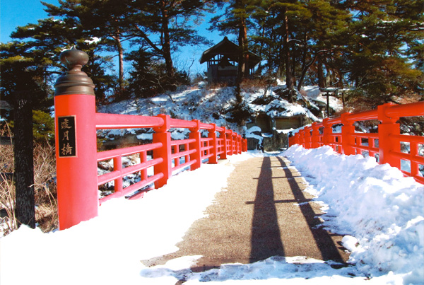 2026年01月:初春の陽光が照らす雄島に架かる朱塗りの渡月橋